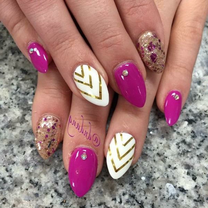 hot pink and beige nail polish, decorated with golden glitter and stripes, on oval pointy manicure