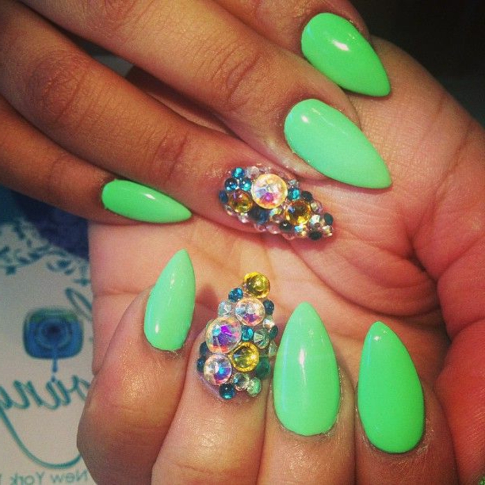 vibrant neon green nail polish, on oval sharp manicure, two of the nails are encrusted, in multicolored rhinestone gem stickers