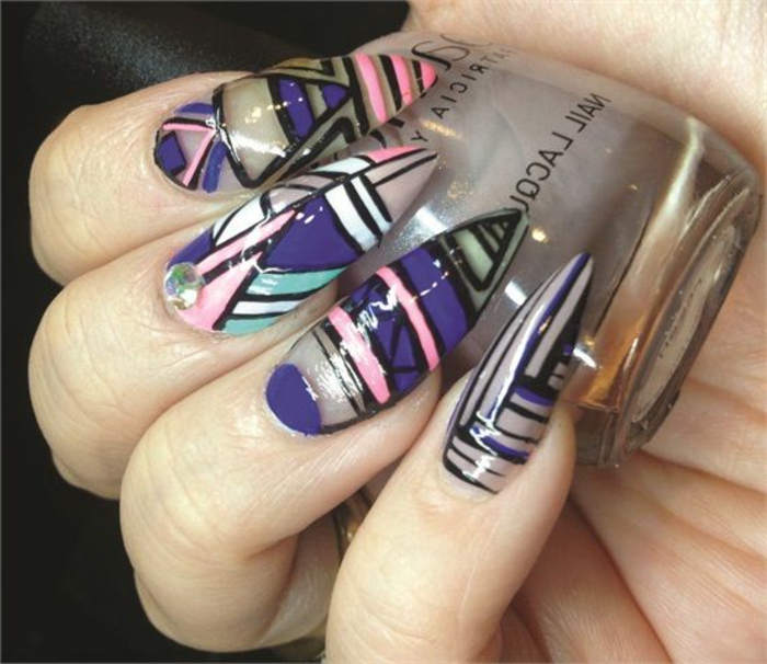 candy pink and turquoise contrasting nail polish, decorated with black lines, on sharp long manicure