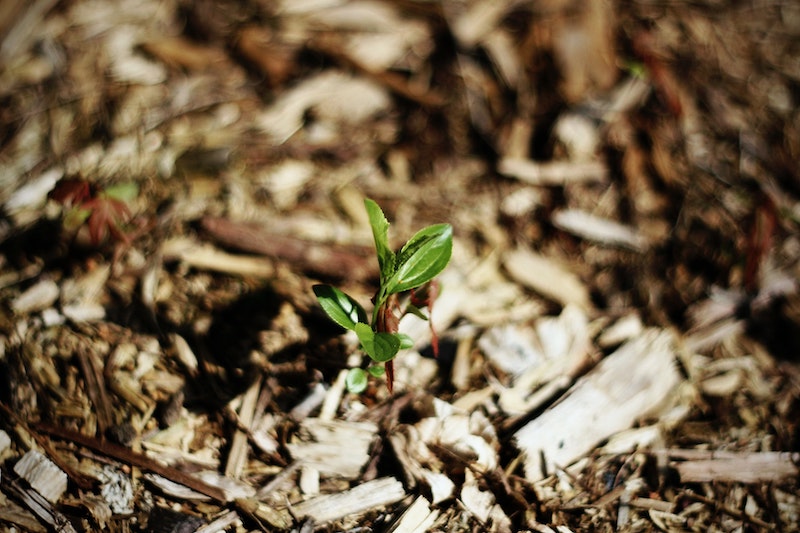 little green plant covered in mulch